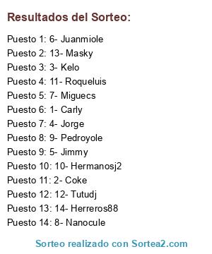 Lista de participantes: 1- Carly, 2- Coke, 3- Kelo, 4- Jorge, 5- Jimmy, 6- Juanmiole, 7- Miguecs, 8- Nanocule, 9- Pedroyole, 10- Hermanosj2, 11- Roqueluis, 12- Tutudj, 13- Masky, 14- Herreros88.