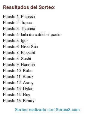 Lista de participantes: Blizzard, Nikki Sixx, Picassa, laila de catriel el pastor, Dylan, Sushi, Kimey, Tupac, Igor, Roy, Thaiana, Kobe, Arany, Baruk, Hannah.