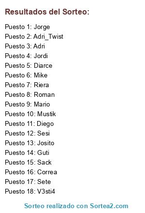 Lista de participantes: Adri, Roman, Guti, Jordi, Mario, Sack, Jorge, Mustik, Riera, Diego, V3sti4, Adri_Twist, Correa, Diarce, Sete, Sesi, Mike, Josito.