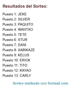 Lista de participantes: ERICK, TETE, KELUS, CARLY, SILVER, STUR, JEKE, PAQUITO, TITO, DANI, WANTXO, KAYAO, XABIKAZE.
