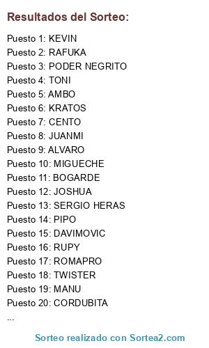 Lista de participantes: Sepi_10_el_jefe, WACE180, Wolf_ZRZ, Warrior_XXII, makoteam13, Ejoseant, vakilla123456, Javikoke.