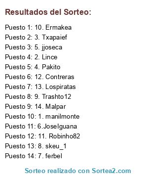 Lista de participantes: 1. manilmonte, 2. Lince, 3. Txapaief, 4. Pakito, 5. jjoseca, 6.JoseIguana, 7. ferbel, 8. skeu_1, 9. Trashto12, 10. Ermakea, 11. Robinho82, 12. Contreras, 13. Lospiratas, 14. Malpar.