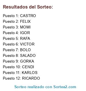 Lista de participantes: FELIX, BOLO, SALADO, KARLOS, RICARDO, GORKA, CASTRO, IGOR, CENDI, MOMI, VICTOR, RAFA.