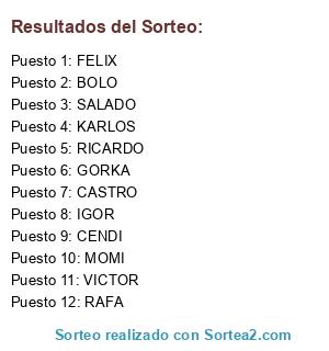 Lista de participantes: GORKA, KARLOS, FELIX, SALADO, RAFA, CASTRO, MOMI, IGOR, CENDI, VICTOR, BOLO, RICARDO.