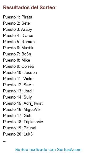 Lista de participantes: Abi, Adri_Twist, Araby, Bo3n, Correa, Diarce, Guidars, Guti, Isra, Jordi, Jorge, Joseba, Luk3, MigueVik, Mike, Mustik, Pirata, Pitunai, Roman, Sack, Sete, Suly, Triplakovic, Victor.
