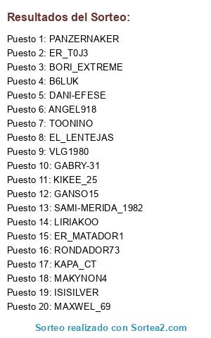 Lista de participantes: BORI_EXTREME, GANSO15, TOONINO, LIRIAKOO, B6LUK, PANZERNAKER, ER_T0J3, EL_LENTEJAS, SAMI-MERIDA_1982, VLG1980, ISISILVER, ER_MATADOR1, KIKEE_25, KAPA_CT, MAKYNON4, RONDADOR73, ANGEL918, GABRY-31, DANI-EFESE, MAXWEL_69.