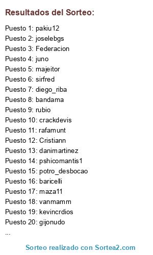 Lista de participantes: bandama, joselebgs, potro_desbocao, vanmamm, polinyy, Federacion, danimartinez, quero10, sirfred, marpe007, lobito1972, juno, gijonudo, rubio, osma1, crackdevis, maza11, diego_riba, AdelVal, alsua, piribiki, thension, baricelli, sully, makaroov69, pakiu12, kevincrdios, Cristiann, davidinho86, moitenerife, juangutierrez91, pshicomantis1, fran_lozano, majeitor, rafamunt, gorretonef.