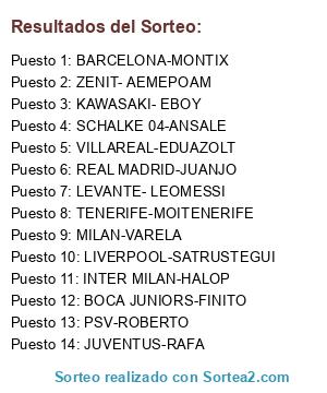 Lista de participantes: ZENIT- AEMEPOAM, LIVERPOOL-SATRUSTEGUI, KAWASAKI- EBOY, LEVANTE- LEOMESSI, MILAN-VARELA, REAL MADRID-JUANJO, TENERIFE-MOITENERIFE, JUVENTUS-RAFA, VILLAREAL-EDUAZOLT, BARCELONA-MONTIX, CHELSEA-KRATOS, PSV-ROBERTO, INTER MILAN-HALOP, BOCA JUNIORS-FINITO, SCHALKE 04-ANSALE.