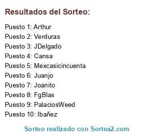 Lista de participantes: Mexcasicincuenta, Arthur, Verduras, Cansa, PalaciosWeed, Ibañez, Juanjo, Joanito, JDelgado, FgBlas.