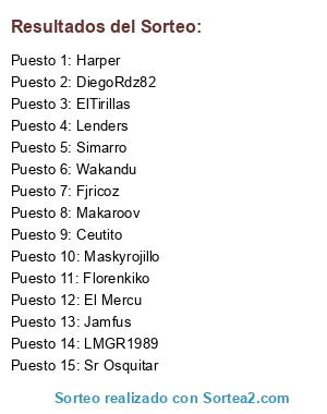 Lista de participantes: Florenkiko, Makaroov, Wakandu, Maskyrojillo, Ceutito, Sr Osquitar, ElTirillas, Fjricoz, LMGR1989, Harper, Lenders, DiegoRdz82, Jamfus, Simarro, El Mercu.
