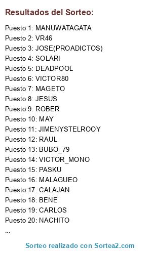 Lista de participantes: SERGIO, DEADPOOL, JOSELITO(MAY), JIMENYSTELROOY, ANDRES, SOLARI, MAY, JESUS, MAGETO, VICTOR80, VICTOR_MONO, PODER, CALAJAN, JOSE(PROADICTOS), MANUWATAGATA, NACHITO, PASKU, MALAGUEO, RAUL, BENE, CARLOS, ROBER, VR46, BUBO_79.