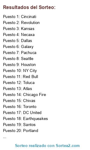 Lista de participantes: Toronto, Toluca, Tigres, Seattle, Santos, Revolution, Red Bull, Pumas, Portland, Philadelphia, Pachuca, NY City, Necaxa, Morelia, León, Los Angeles, Kansas, Houston, Galaxy, Earthqueakes, DC United, Dallas, Columbus, Colorado, Cincinati, Chivas, Chicago Fire, Atlas, Atlanta, América.