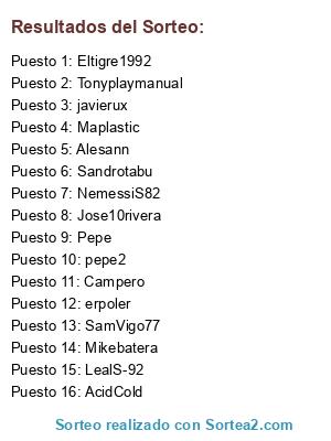 Lista de participantes: Alesann, NemessiS82, javierux, Mikebatera, erpoler, AcidCold, Tonyplaymanual, Jose10rivera, Eltigre1992, Maplastic, LealS-92, SamVigo77, Campero, Pepe, pepe2, Sandrotabu.