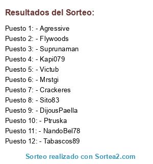 Lista de participantes: - NandoBel78, - Flywoods, - Tabascos89, - Suprunaman, - Mrstgi, - Victub, - DijousPaella, - Kapi079, - Agressive, - Crackeres, - Ptruska, - Sito83.
