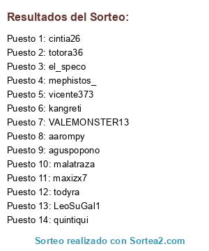 Lista de participantes: VALEMONSTER13, LeoSuGal1, malatraza, cintia26, vicente373, maxizx7, quintiqui, el_speco, totora36, kangreti, aguspopono, aarompy, mephistos_, todyra.