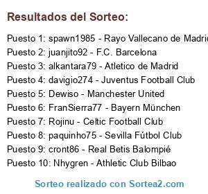 Lista de participantes: juanjito92 - F.C. Barcelona, alkantara79 - Atletico de Madrid, cront86 - Real Betis Balompié, FranSierra77 - Bayern München, Nhygren - Athletic Club Bilbao, paquinho75 - Sevilla Fútbol Club, davigio274 - Juventus Football Club, Rojinu - Celtic Football Club, spawn1985 - Rayo Vallecano de Madrid, Dewiso - Manchester United.