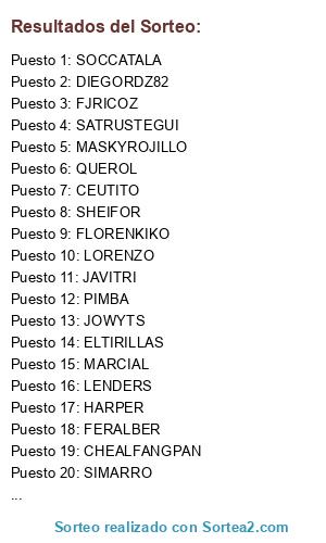 Lista de participantes: JOWYTS, HARPER, MASKYROJILLO, ELTIRILLAS, BIT, WAITAS, FJRICOZ, CHEALFANGPAN, PIMBA, SHEIFOR, JAVITRI, DIEGORDZ82, KING BORJA, LENDERS, WAKANDU, QUEROL, SOCCATALA, SIMARRO, CEUTITO, SATRUSTEGUI, LORENZO, MARCIAL, FERALBER, FLORENKIKO.