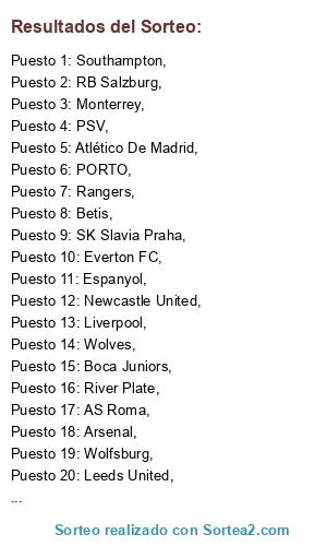 Lista de participantes: AC Milán,, Arsenal,, AS Mónaco,, AS Roma,, Aston Villa,, Atlético De Madrid,, Bayern Leverkusen,, Besiktas,, Betis,, Boca Juniors,, CELTIC,, Chelsea,, Espanyol,, Everton FC,, Barcelona,, Fenerbahce,, Leeds United,, Liverpool,, Marsella,, Monterrey,, Newcastle United,, OGC NIZA,, PORTO,, PSV,, Rangers,, RB Salzburg,, River Plate,, Shakhtar Donetsk,, SK Slavia Praha,, Southampton,, Wolfsburg,, Wolves,.