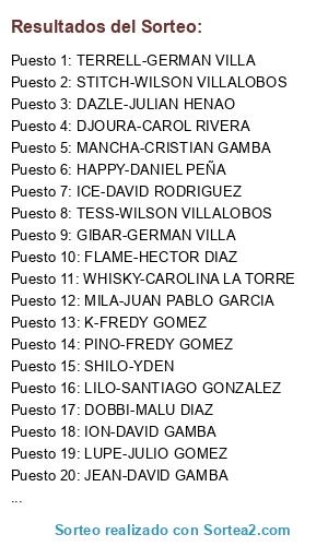 Lista de participantes: JEAN-DAVID GAMBA, ION-DAVID GAMBA, SHENOA-CESAR VARGAS, MANCHA-CRISTIAN GAMBA, MIKE-GERMAN MORENO, LUPE-JULIO GOMEZ, RIO-JACKSON ORTIZ, BOLLITO-ALEJANDRO POSADA, NICOLAS-LILIANA BERNAL, NIX-LUIS MOLANO, HEMI-LUIS MOLANO, DJOURA-CAROL RIVERA, FERGUS-GERMAN VILLA, HAGEN-GERMAN VILLA, GIBAR-GERMAN VILLA, TERRELL-GERMAN VILLA, K-FREDY GOMEZ, IMAGINE-HECTOR DIAZ, FLAME-HECTOR DIAZ, MIKE-DAVID RODRIGUEZ, ICE-DAVID RODRIGUEZ, DAZLE-JULIAN HENAO, STITCH-WILSON VILLALOBOS, TESS-WILSON VILLALOBOS, LOLA-CESAR CAMARGO, SIMON-VICTOR GALVIZ, AVI-ADRIANA VELAZQUEZ, EVAN-ADRIANA VELAZQUEZ, KIRA-RODRIGO BENAVIDEZ, ITA-CAMILO QUIÑONEZ, MAYA-ALBERTO, WHISKY-CAROLINA LA TORRE, JACKOP-JOHANA BERNAL, SHILO-YDEN, PINO-FREDY GOMEZ, ZOELL-CRITNA ACE, DOBBI-MALU DIAZ, LILO-SANTIAGO GONZALEZ, ALASKA-SANTIAGO GONZALEZ, HAPPY-DANIEL PEÑA, IKER-VICTOR GALVIZ, MILA-JUAN PABLO GARCIA, QUEEN-CAROL RIVERA.