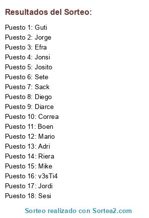 Lista de participantes: Mario, Guti, v3sTi4, Jordi, Adri, Correa, Sesi, Jorge, Mike, Diego, Sete, Josito, Diarce, Riera, Sack, Boen, Jonsi, Efra.
