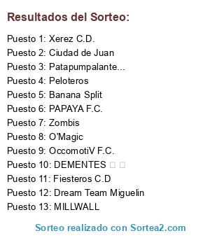 Lista de participantes: Ciudad de Juan, Dream Team Miguelin, Banana Split, DEMENTES ③ ♕, Patapumpalante..., OccomotiV F.C., Xerez C.D., Zombis, MILLWALL, Fiesteros C.D, PAPAYA F.C., Peloteros, O'Magic.