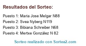 Lista de participantes: Maria Jose Melgar N88, Amy Olson N 73, Svea Nyberg N119, Asunción Herrera Cano N 62, Lidia Luino N77, Bibiana Schreiber N68, Mertxe González N 82, Silvia Cristina Lavié N 75, Lupiz Davila Gomez N137, Giovanna Leon N230.