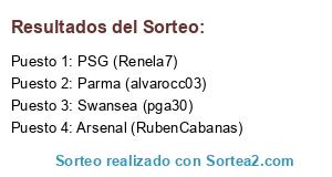 Lista de participantes: PSG (Renela7), Swansea (pga30), Arsenal (RubenCabanas), Parma (alvarocc03).