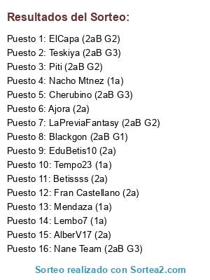 Lista de participantes: EduBetis10 (2a), Lembo7 (1a), Mendaza (1a), Blackgon (2aB G1), Fran Castellano (2a), Nane Team (2aB G3), Nacho Mtnez (1a), Ajora (2a), LaPreviaFantasy (2aB G2), Tempo23 (1a), Piti (2aB G2), AlberV17 (2a), Betissss (2a), Cherubino (2aB G3), Teskiya (2aB G3), ElCapa (2aB G2).