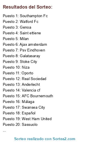 Lista de participantes: Leicester City, West Bromwich, Newcastle United, Southampton Fc, Stoke City, Swansea City, Watford Fc, West Ham United, Atalanta, Genoa, Chievo verona, Milan, Sampdoria, Sassuolo, Udinese, Girondins bordeau, Lille, Nantes, Montpellier, Niza, Saint ettiene, Toulouse, Ajax amsterdam, AZ alkmar, Feyenoord, Psv Eindhoven, Celta de Vigo, Español, Deportivo, Ud Las Palmas, Málaga, Real Betis, Real Sociedad, Villarreal Cf, Valencia cf, Oporto, Sporting portugal, Besiktas, Fenerbache, Galatasaray, Sakhtar donets, Sparta mosku, Zenit, Anderlecht, Shalke 04, Leizpig, Eibar, AFC Bournemouth, Stade rennais.