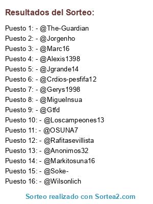 Lista de participantes: - @OSUNA7, - @Soke-, - @Gerys1998, - @Marc16, - @Wilsonlich, - @Gtfd, - @Rafitasevillista, - @Jorgenho, - @Loscampeones13, - @Alexis1398, - @Crdios-pesfifa12, - @MigueInsua, - @Anonimos32, - @Jgrande14, - @The-Guardian, - @Markitosuna16.