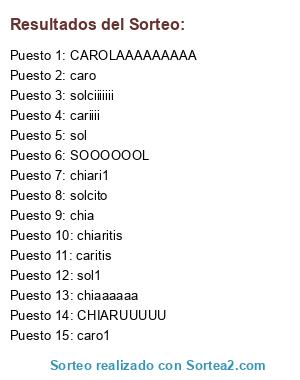 Lista de participantes: CAROLAAAAAAAAA, SOOOOOOL, CHIARUUUUU, cariiii, solciiiiiii, chiaaaaaa, chia, caro, sol, sol1, caro1, chiari1, solcito, chiaritis, caritis.