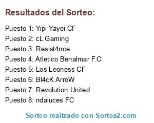 Lista de participantes: cL Gaming, ndaluces FC, Atletico Benalmar F.C, Resist4nce, Bl4cK ArroW, Revolution United, Yipi Yayei CF, Los Leoness CF.