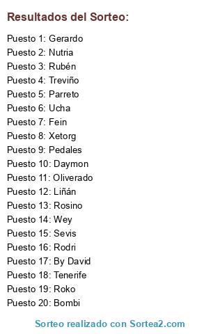 Lista de participantes: Danivalde, NUtria, Xikeras, Weas, Nicolao, Pregal, Hipolito, Parrita, Feindark, Plaza, Arteroman, Biri, Escudero, Eneko, Jonan, Amerrio, Qememetes, Juan, Cantabria, Iborra, Frako, Kalamar, Raulmar, Vengador.