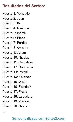 Lista de participantes: Danivalde, NUtria, Xikeras, Weas, Nicolao, Pregal, Hipolito, Parrita, Feindark, Plaza, Arteroman, Biri, Escudero, Eneko, Jonan, Amerrio, Qememetes, Juan, Cantabria, Iborra, Frako, Kalamar, Raulmar, Vengador.
