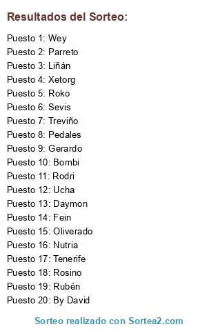 Lista de participantes: Xetorg, Roko, Daymon, Pedales, Liñán, Fein, Rubén, Rodri, Gerardo, Wey, Ucha, Oliverado, Sevis, Bombi, Parreto, Nutria, Rosino, By David, Treviño, Tenerife.