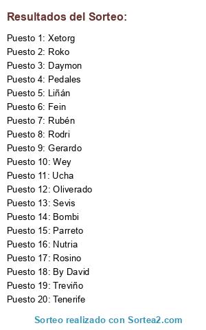 Lista de participantes: Pelaez, David, Puskas, Nadal, Dani, Raulmar, Toño, Bombi, Iborra, Cape, Ruben, Parretto, Fein, Nutria, Amerrio, Wing, Luca, Pablo.