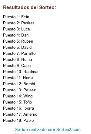 Lista de participantes: Pelaez, David, Puskas, Nadal, Dani, Raulmar, Toño, Bombi, Iborra, Cape, Ruben, Parretto, Fein, Nutria, Amerrio, Wing, Luca, Pablo.