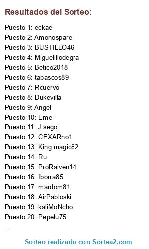 Lista de participantes: Amonospare, ProRaiven14, CEXARno1, eckae, BUSTILLO46, Ferminnn, TONY, Iborra85, Dukevilla, mardom81, kaliMoNcho, Lu1z4o, AirPabloski, King magic82, Eme, Maxisrael2005, Angel, Rcuervo, J sego, Sent3nza88, pAdRoNe, osdobla89, Miguelillodegra, Sullendonkey821, Betico2018, Alin, LucaMontana85, oskarkawa, Pepelu75, Ru, tabascos89, Robert McGregor.
