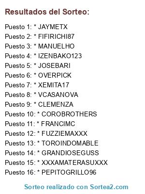 Lista de participantes: * MANUELHO, * CLEMENZA, * TOROINDOMABLE, * COROBROTHERS, * VCASANOVA, * JAYMETX, * IZENBAKO123, * XEMITA17, * GRANDIOSEGUSS, * JOSEBARI, * FUZZIEMAXXX, * FRANCIMC, * FIFIRICHI87, * XXXAMATERASUXXX, * OVERPICK, * PEPITOGRILLO96.