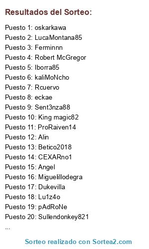 Lista de participantes: Amonospare, ProRaiven14, CEXARno1, eckae, BUSTILLO46, Ferminnn, TONY, Iborra85, Dukevilla, mardom81, kaliMoNcho, Lu1z4o, AirPabloski, King magic82, Eme, Maxisrael2005, Angel, Rcuervo, J sego, Sent3nza88, pAdRoNe, osdobla89, Miguelillodegra, Sullendonkey821, Betico2018, Alin, LucaMontana85, oskarkawa, Pepelu75, Ru, tabascos89, Robert McGregor.