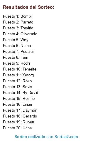 Lista de participantes: Tenerife, Liñán, Gerardo, Fein, Pedales, Rubén, Rodri, Roko, Xetorg, Rosino, Bombi, By David, Sevis, Ucha, Parreto, Treviño, Daymon, Wey, Oliverado, Nutria.