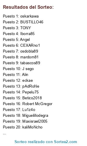 Lista de participantes: Amonospare, ProRaiven14, CEXARno1, eckae, BUSTILLO46, Ferminnn, TONY, Iborra85, Dukevilla, mardom81, kaliMoNcho, Lu1z4o, AirPabloski, King magic82, Eme, Maxisrael2005, Angel, Rcuervo, J sego, Sent3nza88, pAdRoNe, osdobla89, Miguelillodegra, Sullendonkey821, Betico2018, Alin, LucaMontana85, oskarkawa, Pepelu75, Ru, tabascos89, Robert McGregor.