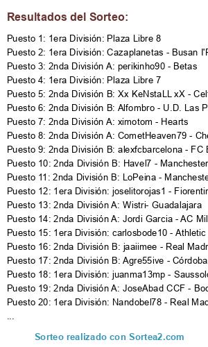 Lista de participantes: 1era División: Cazaplanetas - Busan I'Park, 1era División: Nurhio - At. Madrid, 1era División: Xemita17 - NY Red Bull, 1era División: Plaza Libre 7, 1era División: Nandobel78 - Real Madrid, 1era División: joselitorojas1 - Fiorentina, 1era División: carlosbode10 - Athletic Club de Bilbao, 1era División: Plaza Libre 8, 1era División: juanma13mp - Saussolo, 1era División: Macflai89 - OGC Nice, 2nda División A: merayombasogo - PSG, 2nda División A: X ChachiqueSi X - WBA, 2nda División A: perikinho90 - Betas, 2nda División A: TuSiQueChaves - U.D. Almeria, 2nda División A: Wistri- Guadalajara, 2nda División A: CometHeaven79 - Chelsea FC, 2nda División A: ximotom - Hearts, 2nda División A: JoseAbad CCF - Boca Juniors, 2nda División A: Jordi Garcia - AC Milan, 2nda División A: Vanoel - Zaragoza, 2nda División A: PASA 25 - Oporto, 2nda División B: Havel7 - Manchester United, 2nda División B: LoPeina - Manchester City, 2nda División B: jaaiimee - Real Madrid Castilla, 2nda División B: Alfombro - U.D. Las Palmas, 2nda División B: alexfcbarcelona - FC Barcelona, 2nda División B: Dijouspaella - RCD Espanyol, 2nda División B: Kapi079 - Bayern Munich, 2nda División B: adrylito - Borussia Dortmund, 2nda División B: Agre55ive - Córdoba CF, 2nda División B: Victub - U.D.Vall de Uxó, 2nda División B: Xx KeNstaLL xX - Celta de Vigo.