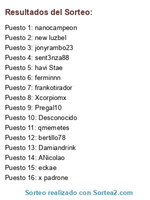 Lista de participantes: ANicolao, bertillo78, Damiandrink, eckae, ferminnn, frankotirador, havi Stae, jonyrambo23, nanocampeon, new luzbel, Pregal10, qmemetes, sent3nza88, x padrone, Xcorpiomx, Desconocido.