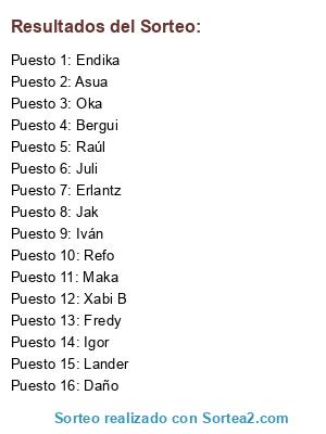 Lista de participantes: Asua, Lander, Refo, Igor, Maka, Raúl, Xabi B, Erlantz, Iván, Oka, Daño, Jak, Juli, Endika, Fredy, Bergui.