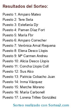 Lista de participantes: María Fbr(3 participaciones), Pamen Díaz Fort(3 participaciones), Concha Llopis Coll(3 participaciones), Tere Seta(3 participaciones), Merche Moreno(3 participaciones), Mª Carmen Andreu(3 participaciones), Elena Desco Llopis(3 participaciones), Verónica Arnal Requena(3 participaciones), Alicia Desco Llopis(3 participaciones), Estefanía Djr, Amparo Correcher, Sus Alco(3 participaciones), Lorena Trilles González, María Carbonell(3 participaciones), Patricia Cobacho Juan(3 participaciones), Amparo Mateo(3 participaciones), Inma Vázquez(3 participaciones).