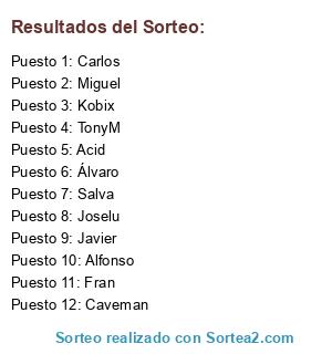Lista de participantes: Fran, Miguel, Álvaro, Alfonso, Acid, Caveman, Salva, TonyM, Javier, Kobix, Carlos, Joselu.