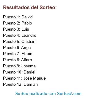 Lista de participantes: Efrain, Daniel, Luis, Pablo, Alfaro, Deivid, Damian, Cristian, Josema, Leandro, Jose Manuel, Angel.