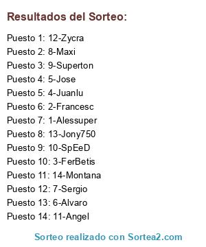 Lista de participantes: 1-Alessuper, 10-SpEeD, 11-Angel, 12-Zycra, 13-Jony750, 14-Montana, 2-Francesc, 3-FerBetis, 4-Juanlu, 5-Jose, 6-Alvaro, 7-Sergio, 8-Maxi, 9-Superton.