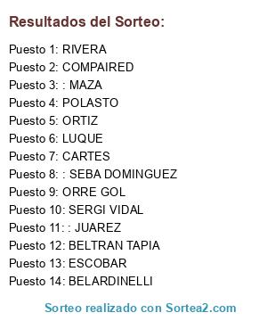Lista de participantes: : SEBA DOMINGUEZ, : JUAREZ, CARTES, BELARDINELLI, BELTRAN TAPIA, : MAZA, ORTIZ, SERGI VIDAL, COMPAIRED, ORRE GOL, LUQUE, POLASTO, ESCOBAR, RIVERA.